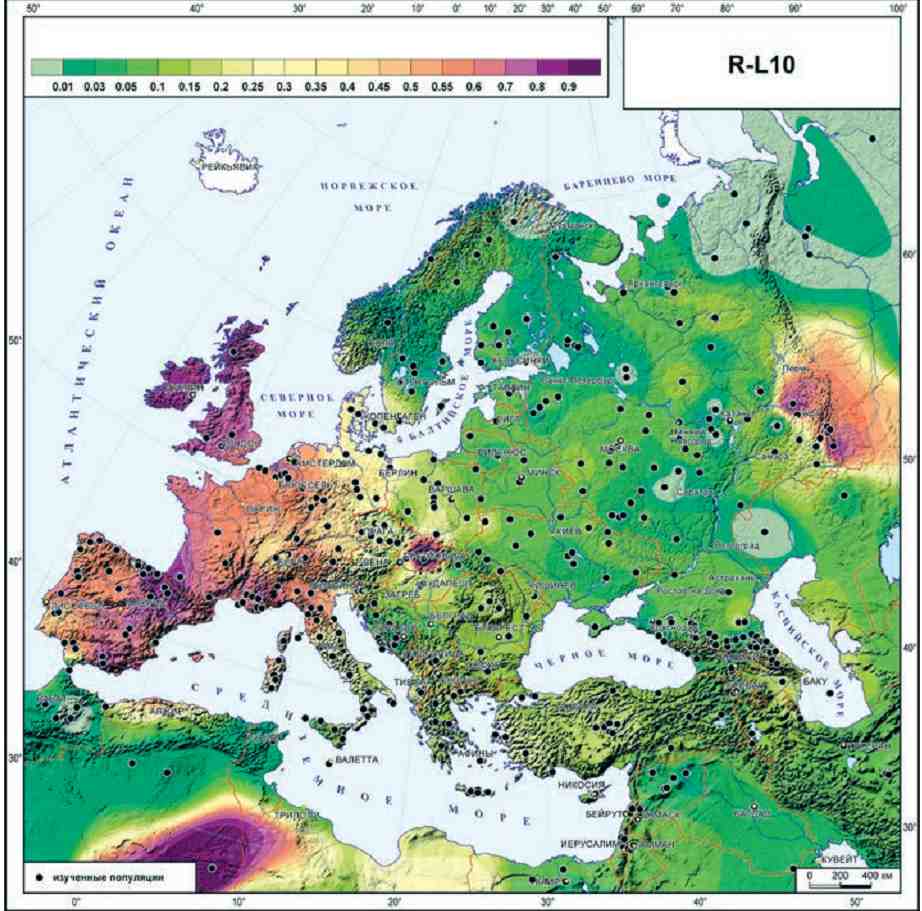 Методы картографирования позволяют перенести на карту разные генетические данные. Часто строят карту распространения частот гаплогрупп Y-хромосомы или мтДНК, Например, так выглядит карта гаплогруппы R1b (L10) в Европе. Высоким частотам этой гаплогруппы соответствуют фиолетовые и коричнево-красные оттенки на карте, низким частотам – зеленые оттенки. Видно, что область максимальных частот R1b – это Западная Европа; есть еще пятно высоких частот на Урале и почему-то в Северной Африке (причины здесь выяснять не будем). https://www.vechnayamolodost.ru/article … chaynikov/
