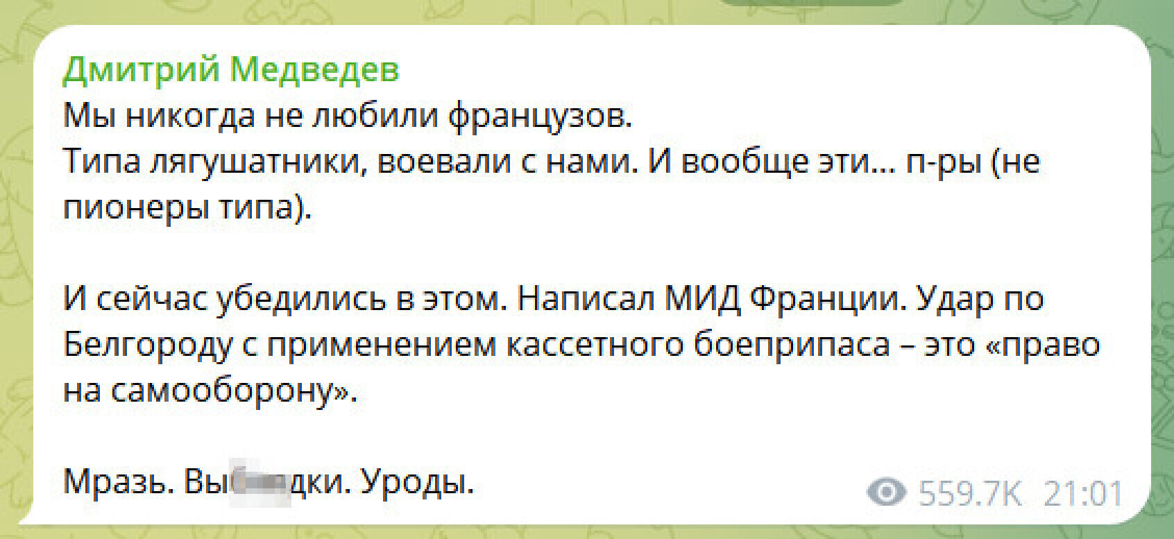"Написал МИД Франции. Удар по Белгороду с применением кассетного боеприпаса - это "право на самооборону", - процитировал зампред СБ РФ."Мразь. Выблядки. Уроды", - отреагировал Медведев.