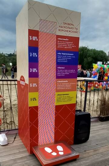 Для плоховидящих - название на автомате "проверь, насколько ты воронежский". Там есть подножка, на которую надо встать. Вес человека он не определяет. Может по внешности считывает скрытой камерой? ))