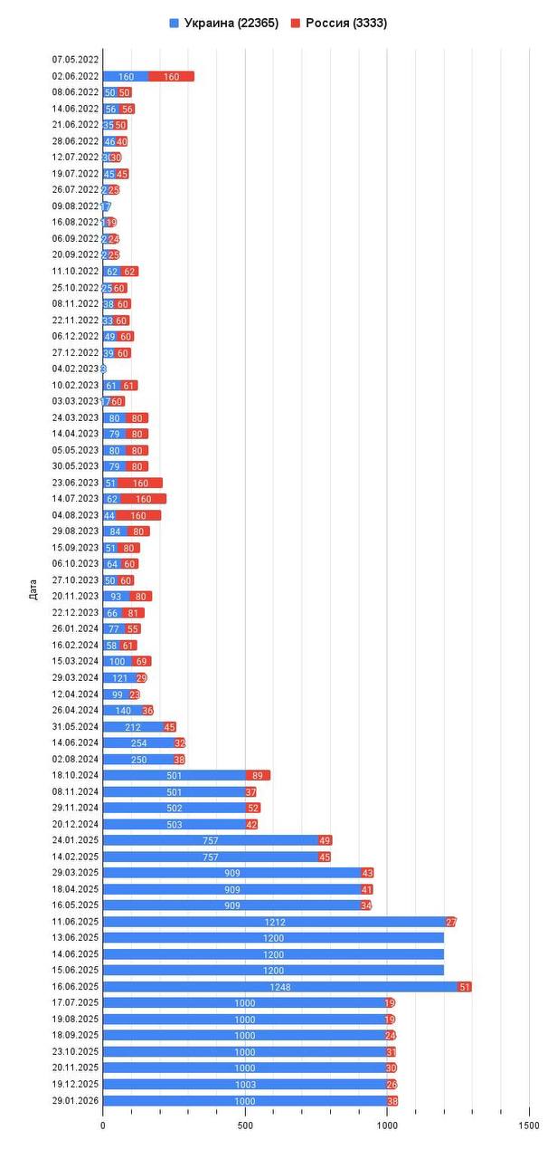 Сегодня произошел первый в этом году обмен тел погибших военных. Украине было передано 1000 тел, России вернули 38. За всё время обменов суммарно было переданно Украине 22365 тел, а России - 3333