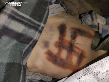 Тело девушки нам показали бойцы ДНР - оно лежит в подвале одной из школ в Мариуполе, где была база националистов "Азова". У девушки оторвана одна рука, на голове видны остатки целлофанового мешка или скотча, а на животе выжжена свастика.